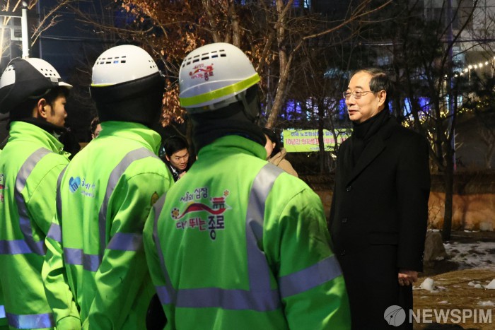 [서울=뉴스핌] 한덕수 국무총리가 1일 오전 서울 종로구 청진공원을 찾아 새해 첫날 작업 중인 환경공무관들을 격려하고 있다. [사진=국무총리실] 2024.01.01 photo@newspim.com