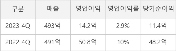 ◆ 4Q, 매출 493억 전년동기 대비 0.4% 증가... 영업이익률 상승전환