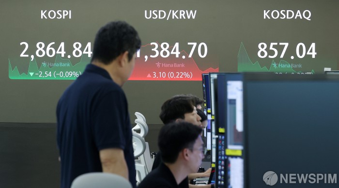 [서울=뉴스핌] 정일구 기자 = 10일 코스피 지수가 전 거래일보다 4.33포인트(0.15%) 하락한 2863.05에 출발했다. 코스닥 지수는 전 거래일대비 1.41포인트(0.16%) 내린 859.01에 시작했다. 달러/원 환율은 전 거래일보다 0.5원 오른 1384.0원에 장을 열었다. 이날 오전 서울 중구 하나은행 딜링룸에서 딜러들이 업무를 보고 있다. 2024.07.10 mironj19@newspim.com