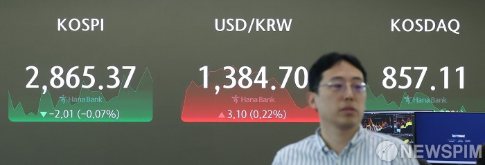 [서울=뉴스핌] 정일구 기자 = 10일 코스피 지수가 전 거래일보다 4.33포인트(0.15%) 하락한 2863.05에 출발했다. 코스닥 지수는 전 거래일대비 1.41포인트(0.16%) 내린 859.01에 시작했다. 달러/원 환율은 전 거래일보다 0.5원 오른 1384.0원에 장을 열었다. 이날 오전 서울 중구 하나은행 딜링룸에서 딜러들이 업무를 보고 있다. 2024.07.10 mironj19@newspim.com