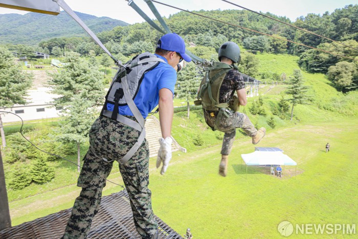 [서울=뉴스핌] 육군사관학교 3학년 생도가 1일 특수전학교에서 진행된 공수 기본 훈련 중 모형 탑에서 힘차게 도약하고 있다. 한편, 육사 생도들은 지난 7월 초부터 이번 주까지 6주간 진행된 하계 군사 훈련을 성공적으로 마무리했다. 훈련 기간 동안 생도들은 미래 육군의 정예 장교로 거듭나기 위해 폭염의 기상과 험준한 지형의 악조건 속에서 자신의 한계를 극복하며 전투 기술과 지휘 통솔 능력, 강인한 군인 정신과 체력을 구비했다. [사진=육군사관학교] 2024.08.08 photo@newspim.com