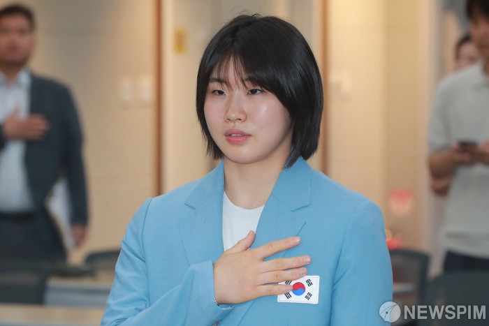 [서울=뉴스핌] 이형석 기자 = 파리 올림픽 은메달리스트 허미미 선수가 14일 오후 서울 여의도 광복회에서 열린 유족 회원증 전달식에서 국기에 대한 경례를 하고 있다. 2024.08.14 leehs@newspim.com