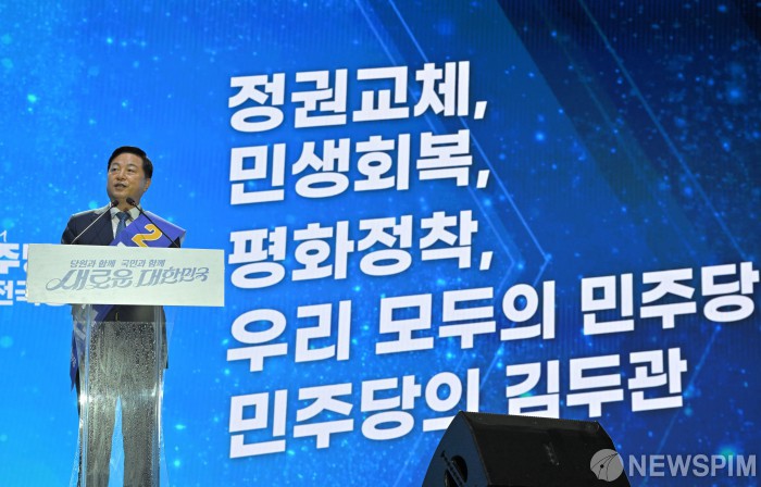 [서울=뉴스핌] 이형석 기자 = 김두관 더불어민주당 대표 후보가 18일 오후 서울 송파구 올림픽공원 KSPO 돔에서 열린 더불어민주당 제1차 정기전국당원대회에서 정견발표를 하고 있다. 2024.08.18 leehs@newspim.com