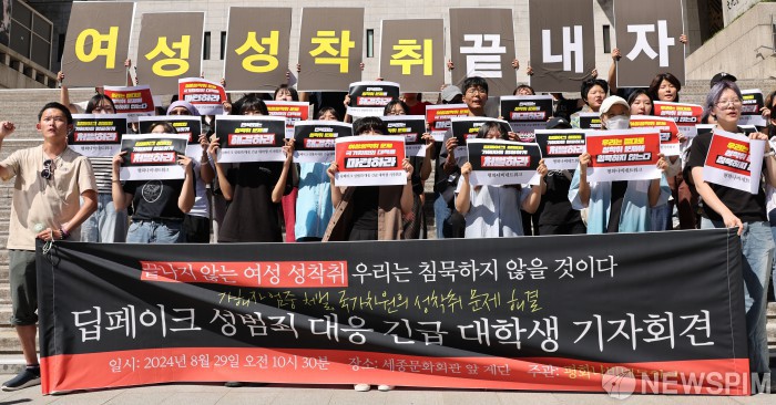 [서울=뉴스핌] 김학선 기자 = 평화나비네트워크 소속 대학생들이 29일 서울 종로구 세종문화회관 앞에서 딥페이크 성범죄대응 긴급 대학생 기자회견을 하고 있다. 2024.08.29 yooksa@newspim.com