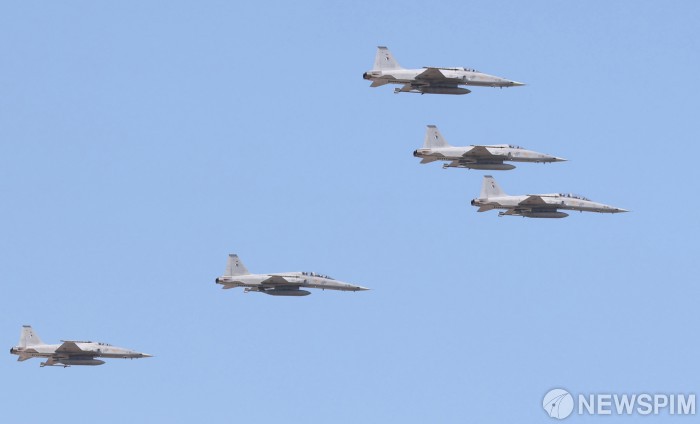 [성남=뉴스핌] 이호형 기자 = ‘강한 국군,국민과 함께’ 건군 76주년 국군의 날 기념식 미디어 데이가 지난 25일 경기 성남 서울공항에서 열린 가운데 고정익 편대비행 전투기 F-5가 분열을 하고 있다. 2024.10.01 leemario@newspim.com