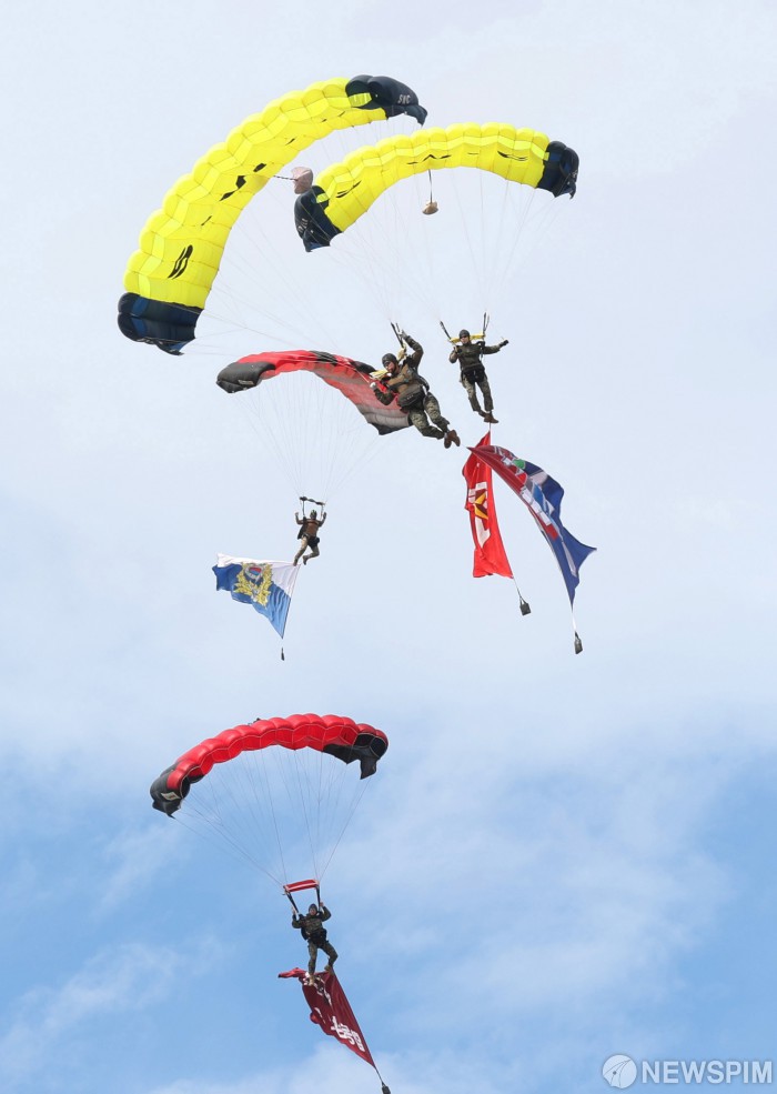 [성남=뉴스핌] 이호형 기자 = ‘강한 국군,국민과 함께’ 건군 76주년 국군의 날 기념식 미디어 데이가 지난 25일 경기 성남 서울공항에서 열린 가운데 기념식행사로 특전사 대원들이 적 종심 타격 집단 고공강하를 선보이고 있다. 2024.10.01 leemario@newspim.com