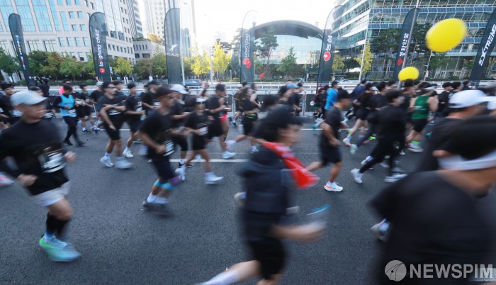 [서울=뉴스핌] 이형석 기자 = 9일 오전 서울 여의도공원 일대에서 열린 마블런 서울 2024에서 참가자들이 출발선을 통과하고 있다. 2024.10.09 leehs@newspim.com