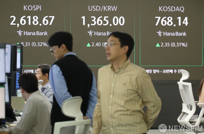 [서울=뉴스핌] 양윤모 기자 = 뉴욕 증시의 주요 3대 주가지수가 하루 만에 반등하며 상승 마감한 가운데, 17일 오전 9시 코스피지수가 전 거래일 종가보다 8.31포인트(0.32%) 상승한 2,618.67로, 코스닥지수는 2.35포인트(0.31%) 상승한 768.14로 오전 거래를 시작하였다. 서울 외환시장에서 달러/원 환율은 전 거래일보다 1.90원(0.14%) 상승한 1,364.50원에 오전 거래를 시작한 가운데, 서울 중구 하나은행 딜링룸에서 직원들이 업무를 보고 있다. 2024.10.17 yym58@newspim.com