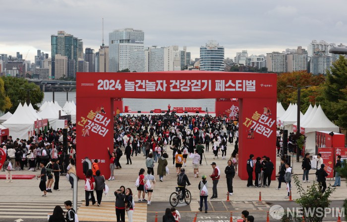 [서울=뉴스핌] 양윤모 기자 = 완연한 가을 날씨가 펼쳐진 19일 오전 서울 여의도 한강공원 이벤트 광장에서 KGC인삼공사(사장 안빈) '정관장'이 주최한 '놀건 놀자! 건강 걷기 페스티벌' 행사 참석자들이 즐거운 시간을 보내고 있다. '놀면서 건강 관리, 놀면서 자기 관리' 콘셉트로 진행되는 이번 행사는 즐거운 걷기 경험을 위해 마련된 것으로, 사전 신청을 완료한 참가자를 포함한 3,000여 명이 여의도 일대를 한 바퀴 도는 총 6.8㎞ 코스를 걷고 다양한 정관장 브랜드 체험 존과 포토 존을 즐길 수 있도록 구성됐다. 2024.10.19 yym58@newspim.com