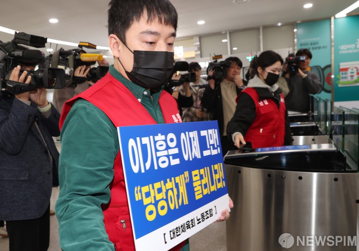 [서울=뉴스핌] 이호형 기자 = 대한체육회 노동조합 조합원들이 피켓을 들고 12일 오후 서울 송파구 올림픽회관서 열린 대한체육회 스포츠공정위원회의 '이기흥 회장 3선 도전' 승인 여부 전체회의 입구로 향하고 있다. 이날 스포츠공정위는 완전 비공개로 진행됐다. 2024.11.12 leemario@newspim.com