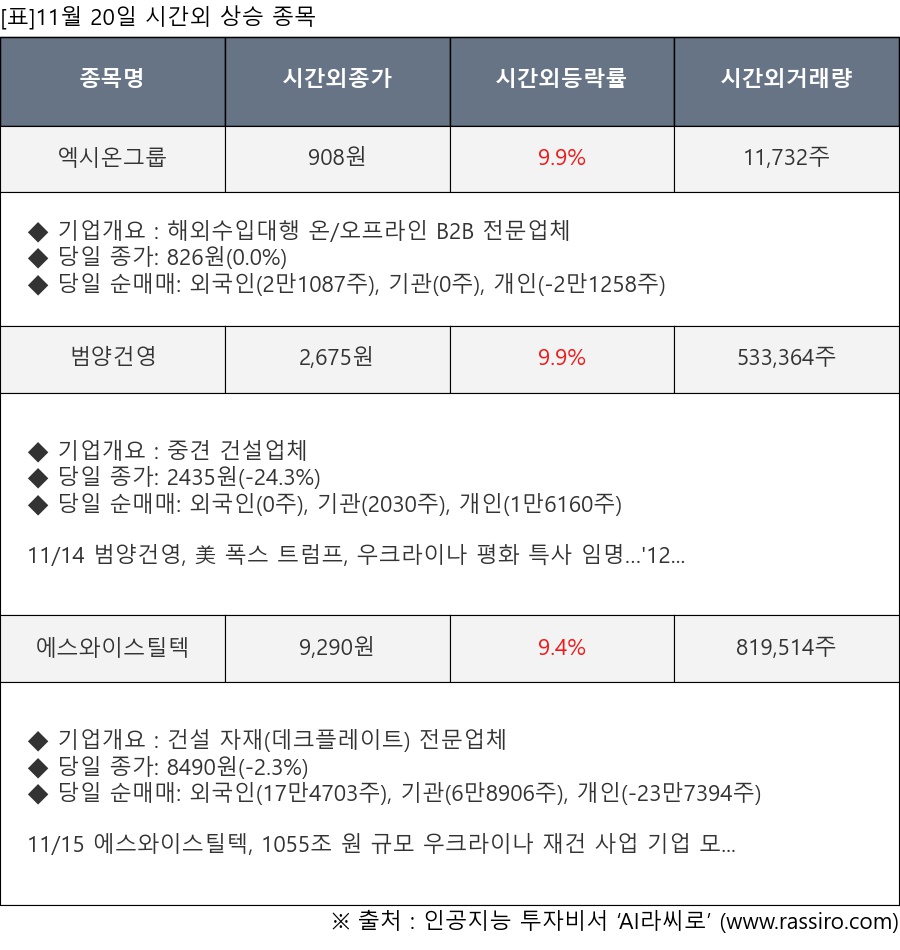 [서울=뉴스핌] 로보뉴스 = 11월 20일, 인공지능 투자비서 ‘AI라씨로’는 시간외 단일가 매매에서 주가가 크게 변동한 엑시온그룹(069920), 범양건영(002410) 등의 최근 동향을 분석해서 발표했다.