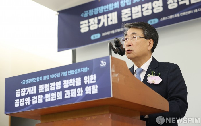 [서울=뉴스핌] 정일구 기자 = 신현윤 한국공정경쟁연합회 회장이 22일 오후 서울 서대문구 스위스 그랜드 호텔에서 열린 한국공정경쟁연합회 창립 30주년 기념 연합 심포지엄에서 개회사를 하고 있다. 2024.11.22 mironj19@newspim.com