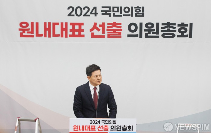 [서울=뉴스핌] 윤창빈 기자 = 국민의힘 원내대표에 출마한 김태호 의원이 12일 오전 서울 여의도 국회에서 열린 원내대표 선출 의원총회에서 정견발표를 하고 있다.2024.12.12 pangbin@newspim.com