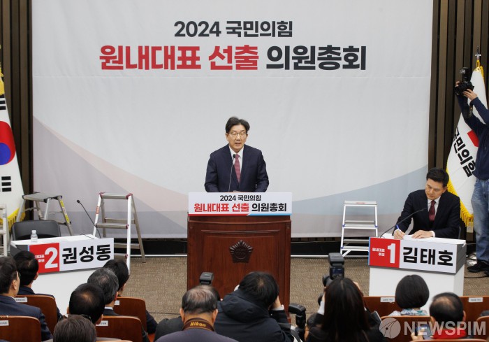 [서울=뉴스핌] 윤창빈 기자 = 국민의힘 원내대표에 출마한 권성동 의원이 12일 오전 서울 여의도 국회에서 열린 원내대표 선출 의원총회에서 정견발표를 하고 있다.2024.12.12 pangbin@newspim.com