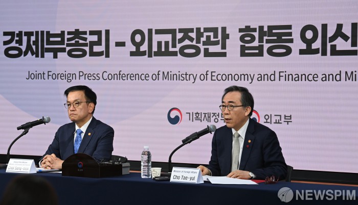 [서울=뉴스핌] 이호형 기자 = 조태열 외교부 장관이 18일 오전 서울 중구 프레스센터에서 열린 합동 외신기자 간담회에서 모두 발언을 하고 있다. 왼쪽은 최상목 경제부총리 겸 기획재정부 장관 2024.12.18 leemario@newspim.com