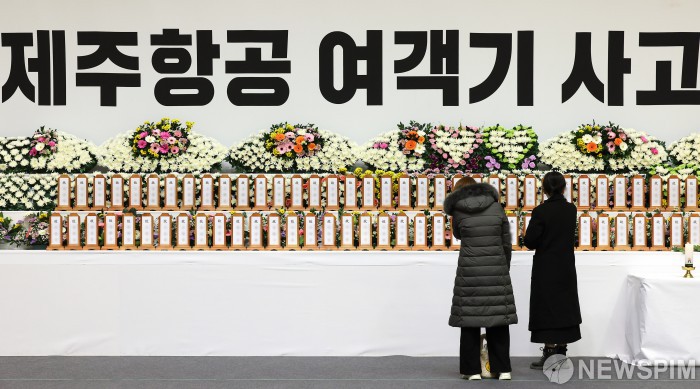 [무안=뉴스핌] 최지환 기자 = 30일 오전 전남 무안군 무안종합스포츠파크에 마련된 제주항공 여객기 사고 희생자 합동분향소에서 조문객들이 조문을 하고 있다. 2024.12.30 choipix16@newspim.com