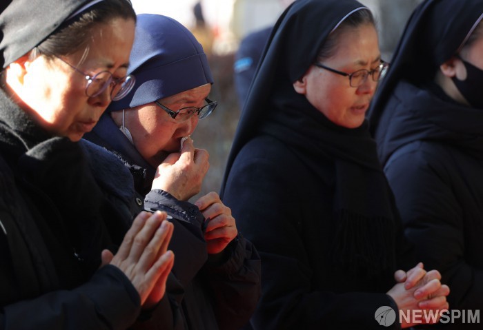 [서울=뉴스핌] 양윤모 기자 = 31일 오전 서울시청 본관 앞에 마련된 '제주항공 여객기 희생자 합동분향소'를 찾은 수녀님들이 기도를 하고 있다. 서울시청 합동분향소는 12. 31.(화)부터 정부가 결정한 국가애도기간인 1. 4.(토)까지 5일간 매일 08시부터 22시까지 운영되며, 운영시간 이후에도 자율적으로 조문할 수 있다.[공동취재] 2024.12.31 yym58@newspim.com