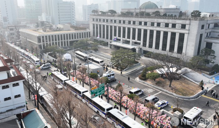 [서울=뉴스핌] 최지환 기자 = 윤석열 대통령이 윤 대통령 탄핵사건 3차 변론기일에 참석하기로 한 21일 서울 종로구 헌법재판소 앞에 경찰 차벽이 설치되는 등 경계가 강화되고 있다. 2025.01.21 choipix16@newspim.com