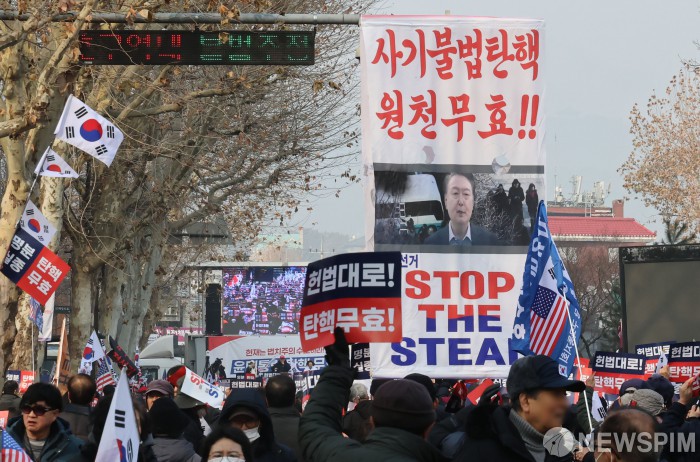 [서울=뉴스핌] 양윤모 기자 = 윤석열 대통령이 21일 오후 2시에 열리는 탄핵 심판 변론에 직접 출석한 가운데, 서울 종로구 헌법재판소 앞에서 윤 대통령 지지자들이 집회를 하고 있다. 2025.01.21 yym58@newspim.com