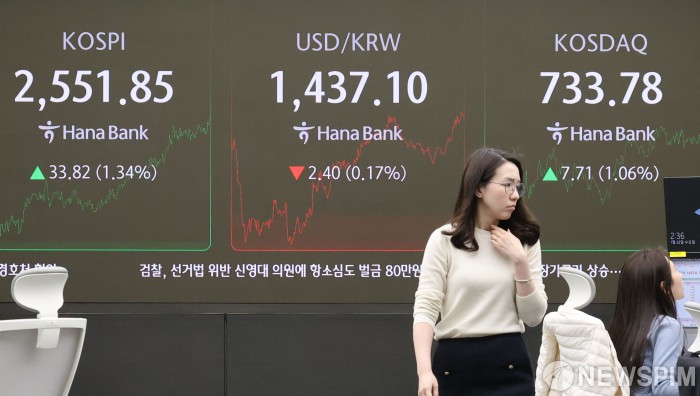 [서울=뉴스핌] 양윤모 기자 = 22일 오후 2시38분 코스피 지수가 전 거래일 종가보다 33.82포인트(1.34%) 오른 2,551.85로, 코스닥 지수는 7.71포인트(1.06%) 오른 733.78로 거래를 하고있다. 서울 외환시장에서 달러/원 환율은 전 거래일보다 2.40원 내린 1,437.10원에 거래되는 가운데, 서울 중구 하나은행 딜링룸에서 직원들이 업무를 보고 있다. 2025.01.22 yym58@newspim.com