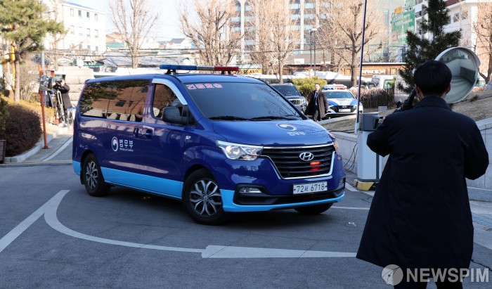 [서울=뉴스핌] 사진공동취재단 = 23일 서울 종로구 헌법재판소에서 열린 윤석열 대통령 탄핵심판 4차 변론기일에서 윤석열 대통령이 탄 차량이 헌재 안으로 들어서고 있다. 2025.01.23 photo@newspim.com