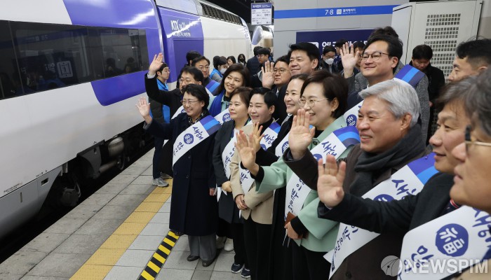[서울=뉴스핌] 김학선 기자 = 김선민 조국혁신당 당대표 권한대행, 황운하 원내대표를 비롯한 의원들이 설 명절을 앞둔 24일 오전 용산역에서 귀성객들을 향해 인사하고 있다. 2025.01.24 yooksa@newspim.com