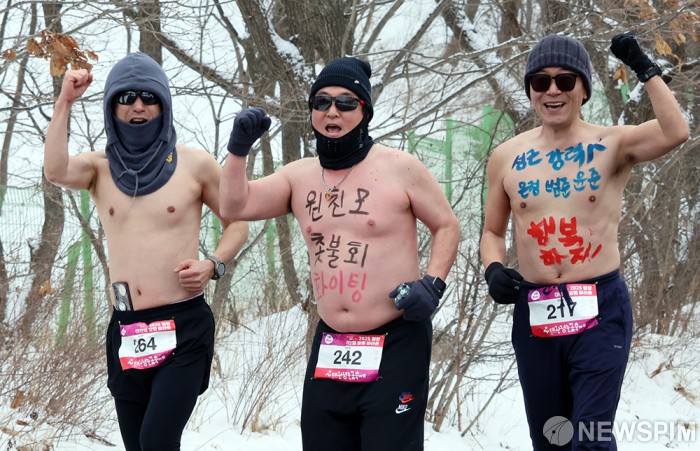 [서울=뉴스핌] 2월의 첫 휴일인 1일 오전 차가운 날씨에도 평창 대관령면 송천 대관령 눈꽃축제장에서 열린 ‘WINTER RUN IN 평창 대관령 알몸 마라톤 대회’에 참가자들이 화이팅을 외치며 힘차게 달리고 있다. 이번 대회는 전국 각지에서 모인 700여 명이 참가자들이 아름다운 설경을 배경으로 5㎞와 10㎞ 등 2개 코스를 달렸다. [사진=평창군청] 2025.02.01 yym58@newspim.com