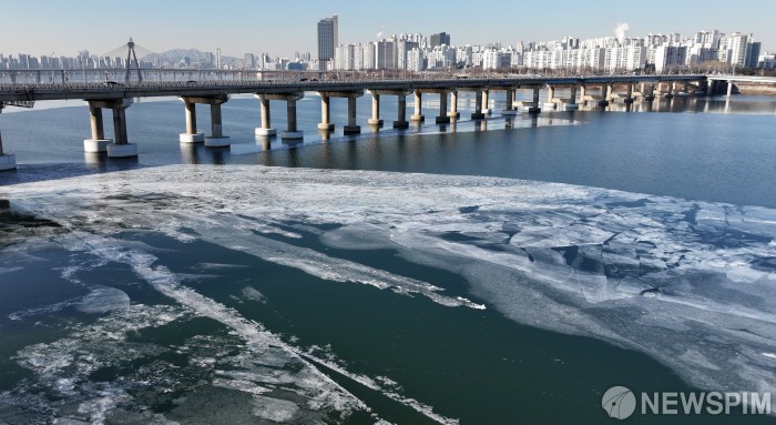 [서울=뉴스핌] 최지환 기자 = 한파가 이어진 6일 오전 서울 송파구 천호대교 인근 한강이 얼어있다. 2025.02.06 choipix16@newspim.com