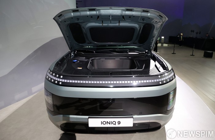 [서울=뉴스핌] 정일구 기자 = 12일 서울 광진구 그랜드 워커힐 서울에서 열린 현대자동차 플래그십 전동화 대형 SUV '아이오닉 9' 미디어 행사에서 신차가 공개되고 있다. 2025.02.13 mironj19@newspim.com