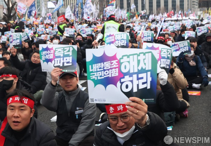[서울=뉴스핌] 이호형 기자 = 15일 오후 서울 종로구 광화문 동십자각 일대에서 윤석열 즉각퇴진 사회대개혁 비상행동 주최로 열린 제11차 범시민대행진에서 참가자들이 윤 대통령의 파면을 촉구하며 구호를 외치고 있다. 2025.02.15 leemario@newspim.com