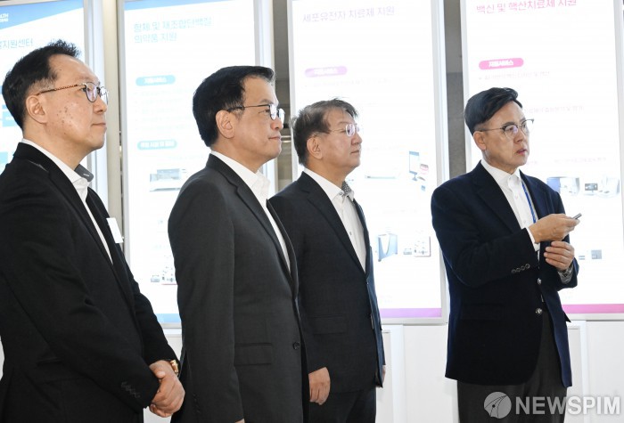 [서울=뉴스핌] 최상목 대통령 권한대행 부총리 겸 기획재정부 장관이 26일 충북 청주 중부권 핵심 바이오 클러스터인 오송 첨단의료복합단지를 방문, 이명수 첨복단지 이사장으로부터 단지 설명을 듣고 있다.[사진=기획재정부] 2025.02.26 photo@newspim.com