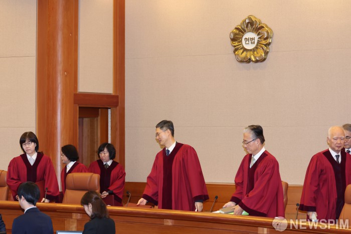 [서울=뉴스핌] 정일구 기자 = 문형배 헌법재판소장 권한대행을 비롯한 헌법재판관들이 27일 오전 서울 종로구 헌법재판소 대심판정에서 열린 우원식 국회의장이 최상목 대통령 권한대행 부총리 겸 기획재정부 장관을 상대로 낸 마은혁 헌법재판관 후보자의 임명 보류 관련 권한쟁의심판 등 사건에 참석하고 있다. 2025.02.27 mironj19@newspim.com