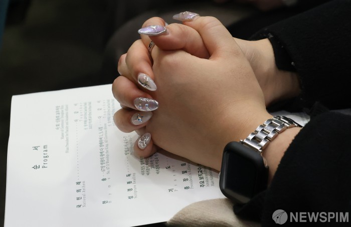 [서울=뉴스핌] 양윤모 기자 = 이화여대 2025학년도 입학식이 28일 오전 이화여대 대강당에서 장명수 이사장, 이향숙 총장, 교수진과 3,000명의 신입생이 참석한 가운데,행사 참석 입학생이 기도하고 있다. 2025.02.28 yym58@newspim.com