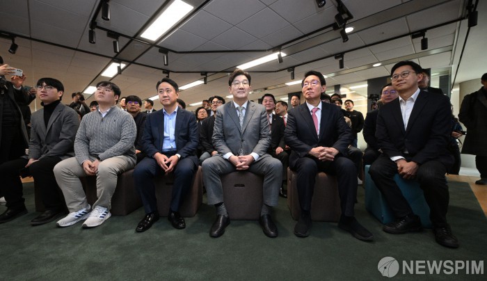 [서울=뉴스핌] 최지환 기자 = 권성동 국민의힘 원내대표를 비롯한 원내 지도부가 6일 오전 서울 강서구 LG AI 연구원에서 열린 'AI G3 도약을 위한 현장 간담회' 참석에 앞서 기업용 AI 서비스 시연을 보고 있다. 2025.03.06 choipix16@newspim.com