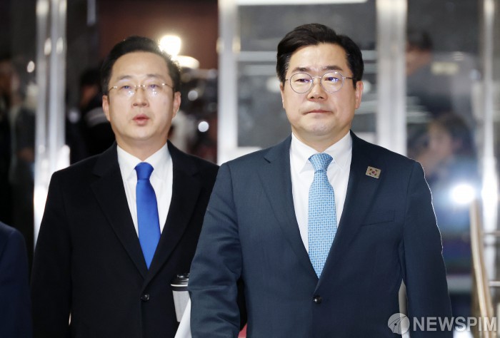 [서울=뉴스핌] 정일구 기자 = 박찬대 더불어민주당 원내대표와 박성준 원내수석부대표가 11일 오후 서울 여의도 국회에서 비공개로 열린 비상의원총회에 참석하고 있다. 2025.03.11 mironj19@newspim.com