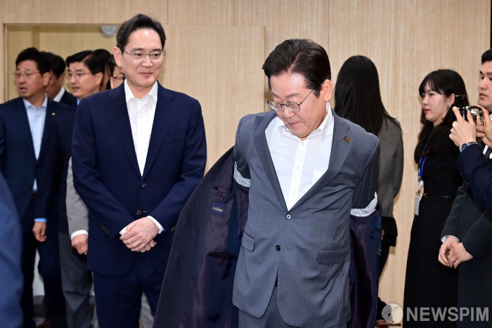 [서울=뉴스핌] 이호형 기자 = 이재명 더불어민주당 대표와 이재용 삼성전자 회장이 20일 오전 서울 강남구 사피(SSAFY·삼성청년소프트웨어)아카데미에서 환담을 나누기 위해 이동하고 있다. 2025.03.20 leemario@newspim.com