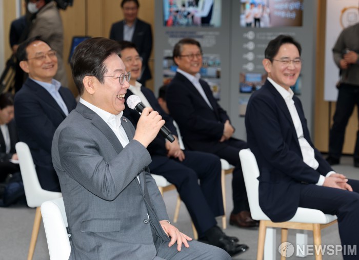 [서울=뉴스핌] 이호형 기자 = 이재명 더불어민주당 대표와 이재용 삼성전자 회장이 20일 서울 강남구 멀티캠퍼스 역삼 SSAFY 서울캠퍼스에서 교육생들과 간담회를 하고 있다. 2025.03.20 leemario@newspim.com