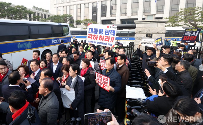 [서울=뉴스핌] 정일구 기자 = 국민의힘과 더불어민주당 의원들이 21일 오전 서울 종로구 헌법재판소 앞에서 각각 윤석열 대통령 탄핵 각하와 즉시 파면을 촉구하는 기자회견을 하고 있다. 2025.03.21 mironj19@newspim.com