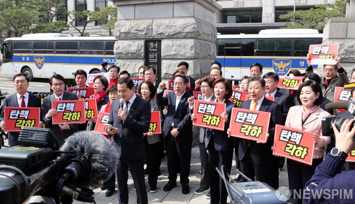 [서울=뉴스핌] 최지환 기자 = 국민의힘 의원들이 24일 서울 종로구 헌법재판소 앞에서 윤석열 대통령 탄핵 반대 기자회견을 열고 있다. 2025.03.24 choipix16@newspim.com