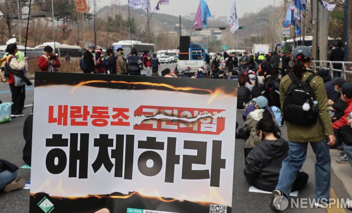 [서울=뉴스핌] 양윤모 기자 = 25일 오후 전농 산하 ‘전봉준 투쟁단’과 행사 참석자들이 서울 서초구 남태령 고개에서 윤 대통령 탄핵 촉구와 평화로운 ‘트랙터 대행진’을 요구 하는 집회를 하고 있다. 2025.03.25 yym58@newspim.com
