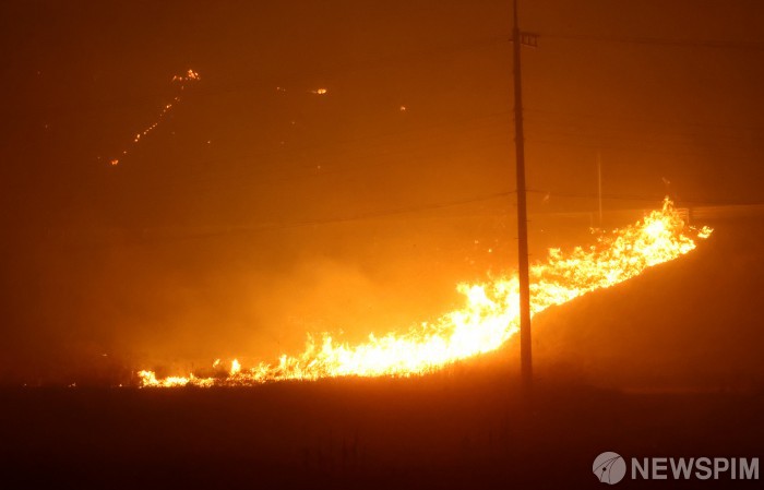 [안동=뉴스핌] 정일구 기자 = 경북 의성에서 발생한 산불이 안동까지 확산하고 있는 25일 오후 경북 안동시 길안면 인근 야산에 산불이 크게 번지고 있다. 2025.03.25 mironj19@newspim.com