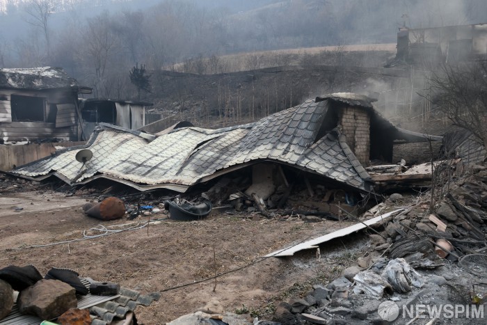 [영양=뉴스핌] 정일구 기자 = 경북 의성에서 발생한 산불이 영양까지 확산된 가운데 26일 오후 경북 영양군 석보면 답곡리 일대 민가가 산불 피해를 입어 전소돼 있다. 2025.03.26 mironj19@newspim.com
