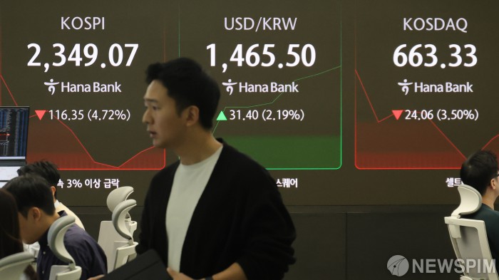 [서울=뉴스핌] 양윤모 기자 = 계속되는 ‘美관세 쇼크'로 7일 오전 코스피 지수가 전 거래일 종가보다 116.35포인트(4.72%) 내린 2,349.07로, 코스닥 지수는 24.06포인트(3.50%) 내린 663.33으로 거래를 시작했다. 서울 외환시장에서 원/달러 환율은 전 거래일보다 31.40원 오른 1,465.50원에 거래되는 가운데, 서울 중구 하나은행 딜링룸에서 직원들이 업무를 보고 있다. 2025.04.07 yym58@newspim.com