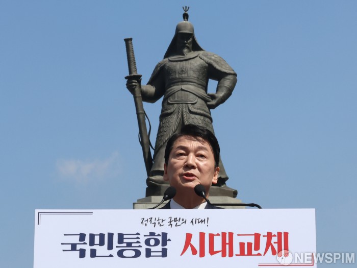 [서울=뉴스핌] 양윤모 기자 = 안철수 국민의힘 의원이 8일 오전 서울 광화문광장 이순신 장군 동상 앞에서 제21대 대통령 선거 출마를 공식 선언하고 있다. 2025.04.08 yym58@newspim.com