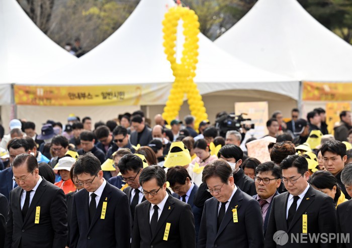 [안산=뉴스핌] 김학선 기자 = 세월호 참사 11주기를 맞은 16일 오후 경기도 안산시 단원구 화랑유원지에서 열린 '세월호참사 11주기 기억식'에서 권영세 국민의힘 비대위원장(왼쪽부터), 김경수 예비후보, 김동연 예비후보, 이재명 예비후보, 박찬대 더불어민주당 원내대표가 희생자들에 대한 묵념을 하고 있다. 2025.04.16 yooksa@newspim.com