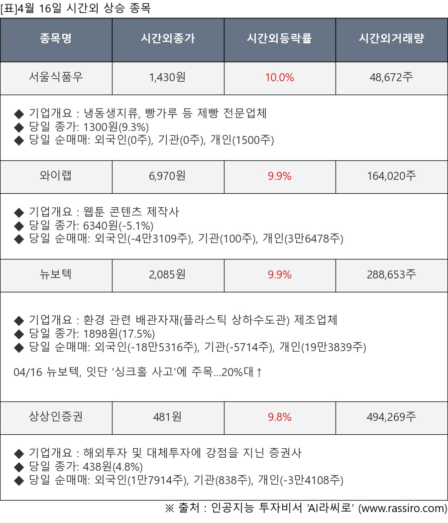 ※ 관련 종목: 서울식품우, 와이랩, 뉴보텍, 상상인증권