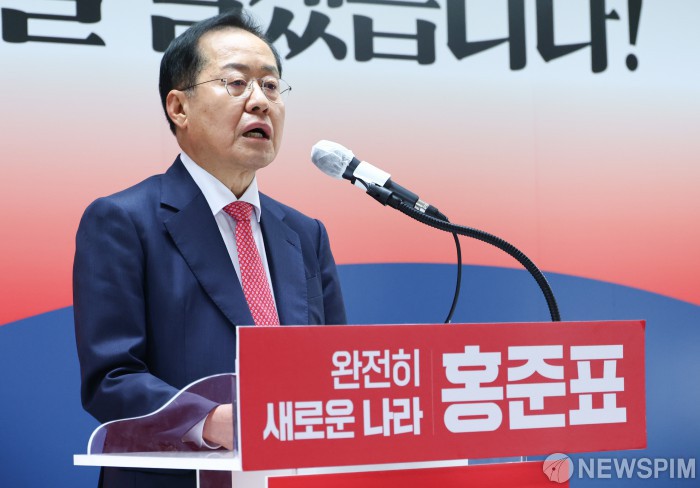 [서울=뉴스핌] 최지환 기자 = 국민의힘 대통령선거 경선후보인 홍준표 전 대구시장이 18일 오전 서울 여의도 선거사무소에서 사회·교육·문화 분야 공약 기자회견을 하고 있다. 2025.04.18 choipix16@newspim.com