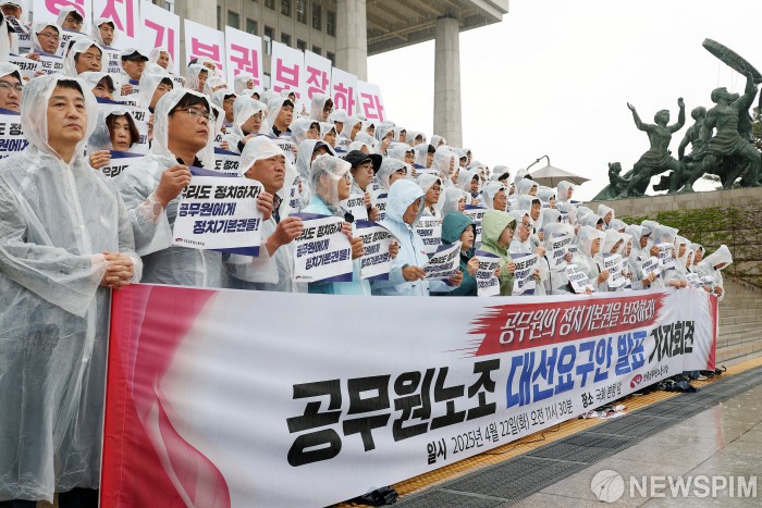 [서울=뉴스핌] 정일구 기자 = 전국공무원노동조합 관계자들이 22일 오전 서울 여의도 국회 본청 앞에서 공무원노조 대선요구안 발표 기자회견을 하고 있다. 2025.04.22 mironj19@newspim.com