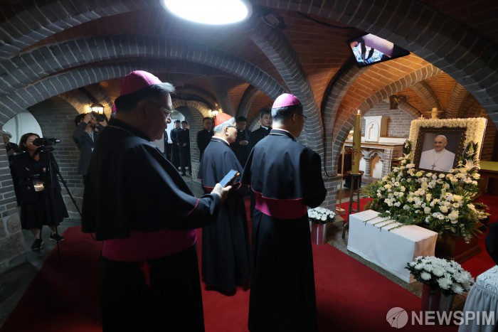 [서울=뉴스핌] 사진공동취재단 = 염수정 추기경, 정순택 대주교 등 서울대교구 주교단이 22일 서울 명동대성당 지하성당에 마련된 프란치스코 교황 빈소를 찾아 조문하고 있다. 2025.04.22 photo@newspim.com
