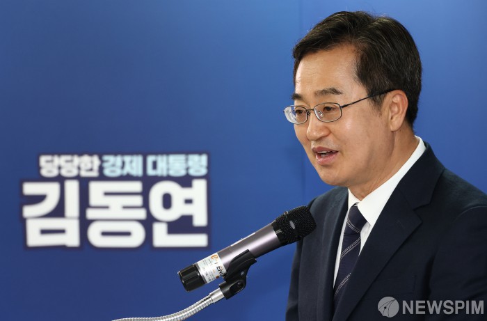 [서울=뉴스핌] 최지환 기자 = 김동연 더불어민주당 대선 경선 후보가 22일 오후 서울 여의도 선거사무소에서 수도권 공통 공약 및 비정규직 관련 정책 공약을 발표하고 있다. 2025.04.22 choipix16@newspim.com